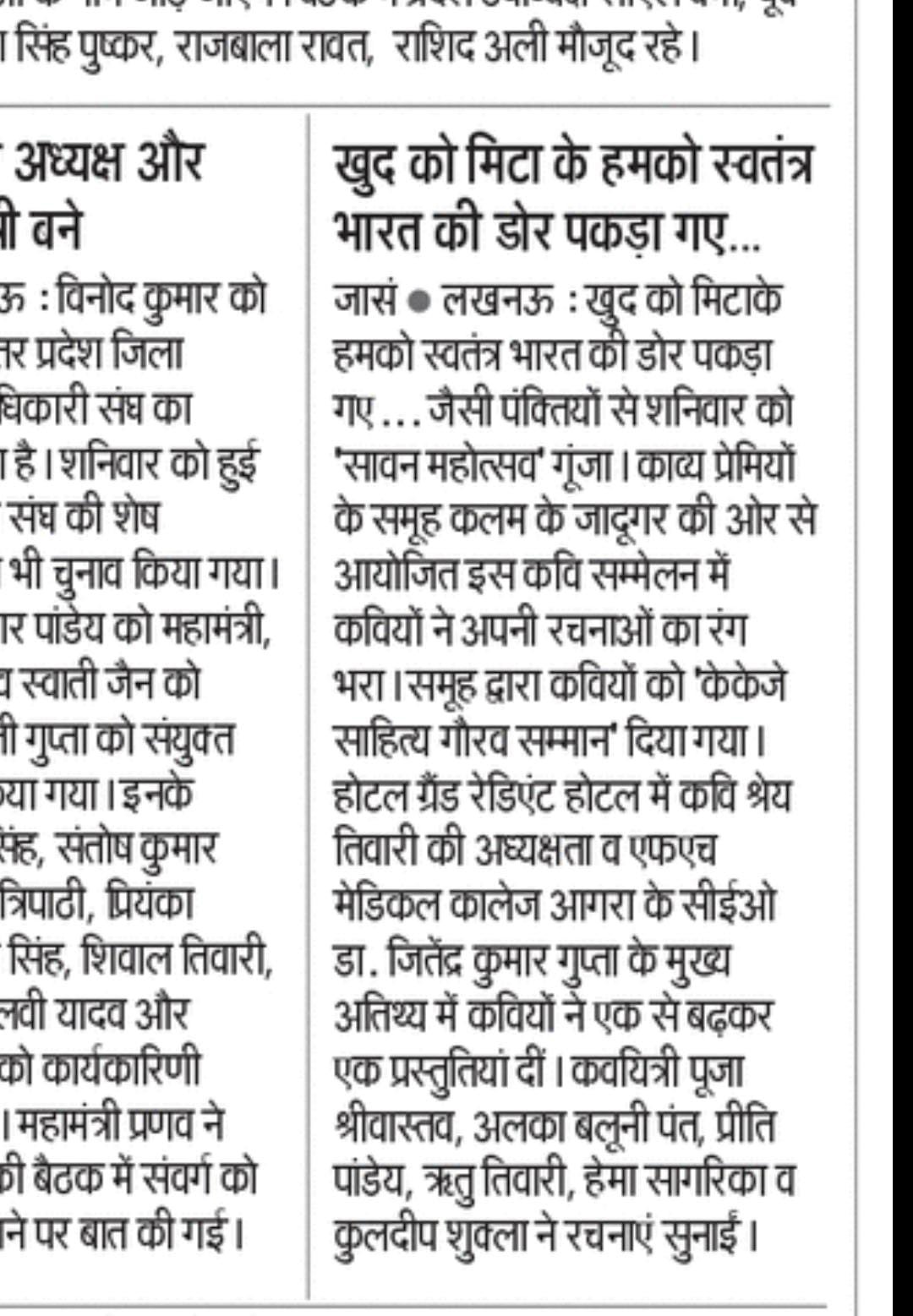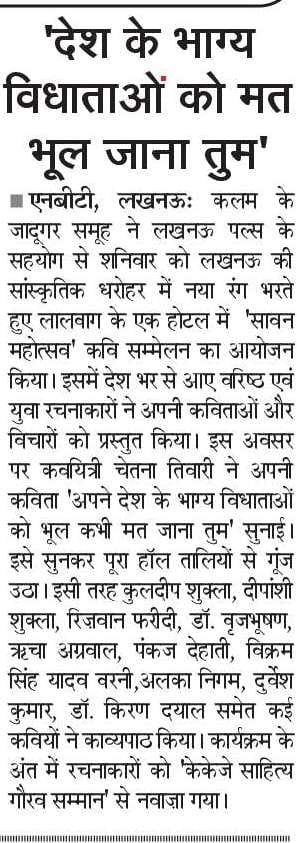 The poets and authors who participated in this wonderful event included Kuldeep Shukla, Deepanshi Shukla, Rizwan Faridi, Dr. Brijbhushan, Richa Agarwal, Pankaj Dehati, Vikram Singh Yadav Barni, Alka Nigam, Durvesh Kumar, Dr. Kiran Dayal, Amit Alp, Ajay Sathi, Sarita Tripathi, Padmanabh Tripathi, Abhilasha Arun, Nirdeshak Kumar Vin, Seema Varnika, Vijay Purohit Biju, Krishna Kumar Dubey, Sudhir Yadav, Prakash Mitravat, Chetna Tiwari, Tarun Jain, Seema Srivastava, Vinay Kumar Sahu Nischal, Poonam Nain Malik, Jagannath Rai, Parul Chaudhary, Birendra Gautam, Usha Sharma, Anju Ahirwar, Manoj Pandey Musafir, Archana Jha, Shraboni Ganguly, Vishu Tiwari, Anju Chaudhary, Shashank Mani Yadav, Sangeeta Verma, Bhupendra Raghav, Nisha Saxena, Anita Arora, Jyoti Sharma, Anjana Jain, and Neelam Yadav. All the poets and authors were awarded the ‘KKJ Sahitya Gaurav Samman’ by Kalam Ke Jadugar Group for their contributions to the upliftment of Hindi poetry literature. The event was attended by literature and poetry enthusiasts from Lucknow. It was widely covered by Print Media – Dainik Jagran and The Times of India group’s Nav Bharat Times.